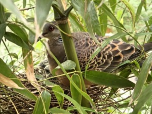 みどりの風 鶴ヶ島の鳩。一度巣立ったあと、再びやってきました。場所は同じく、竹の上の巣。親鳥が一生懸命、子供を育てています。