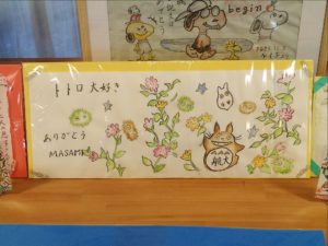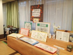 みどりの風鶴ヶ島の1階、地域交流室の作品展示コーナーには、それぞれ、一生懸命作った品が展示されています!