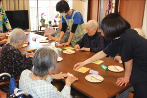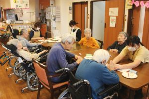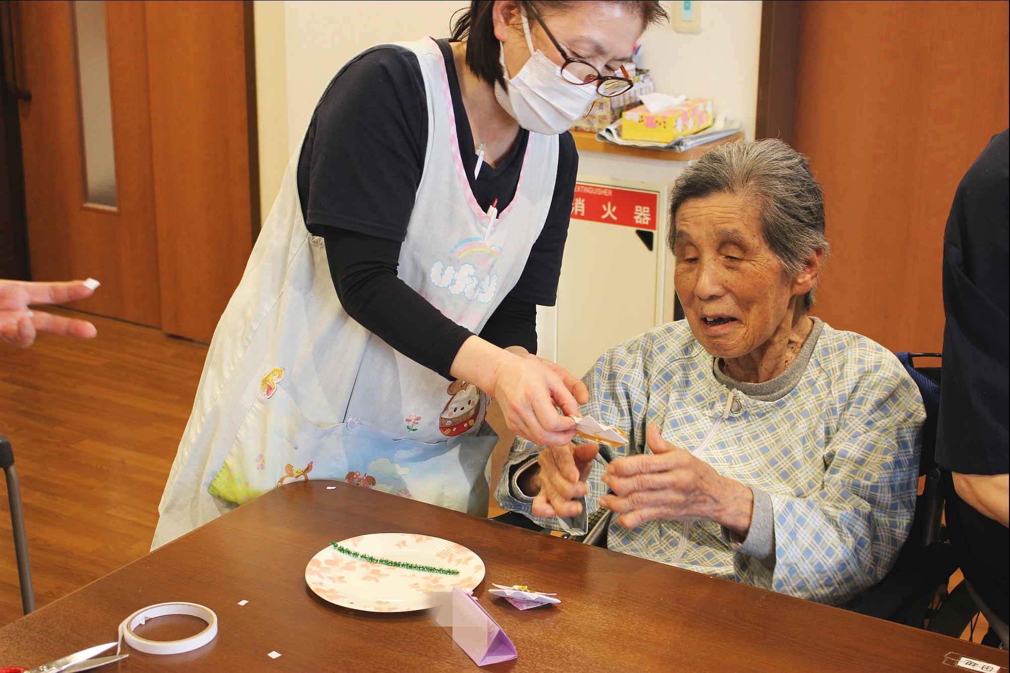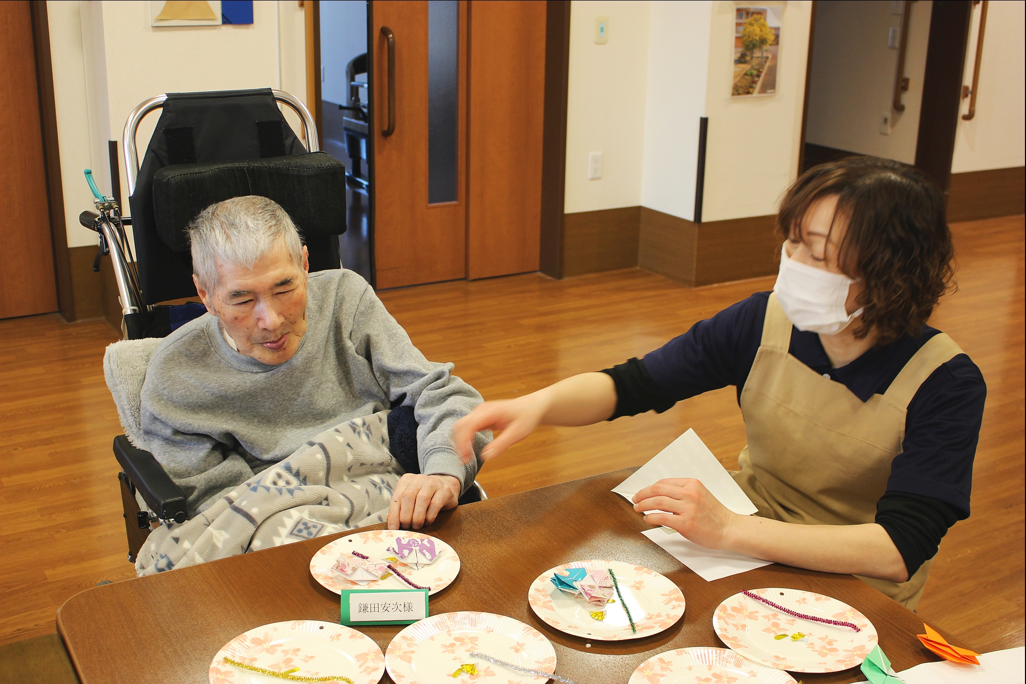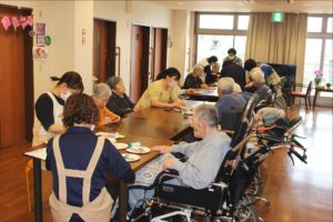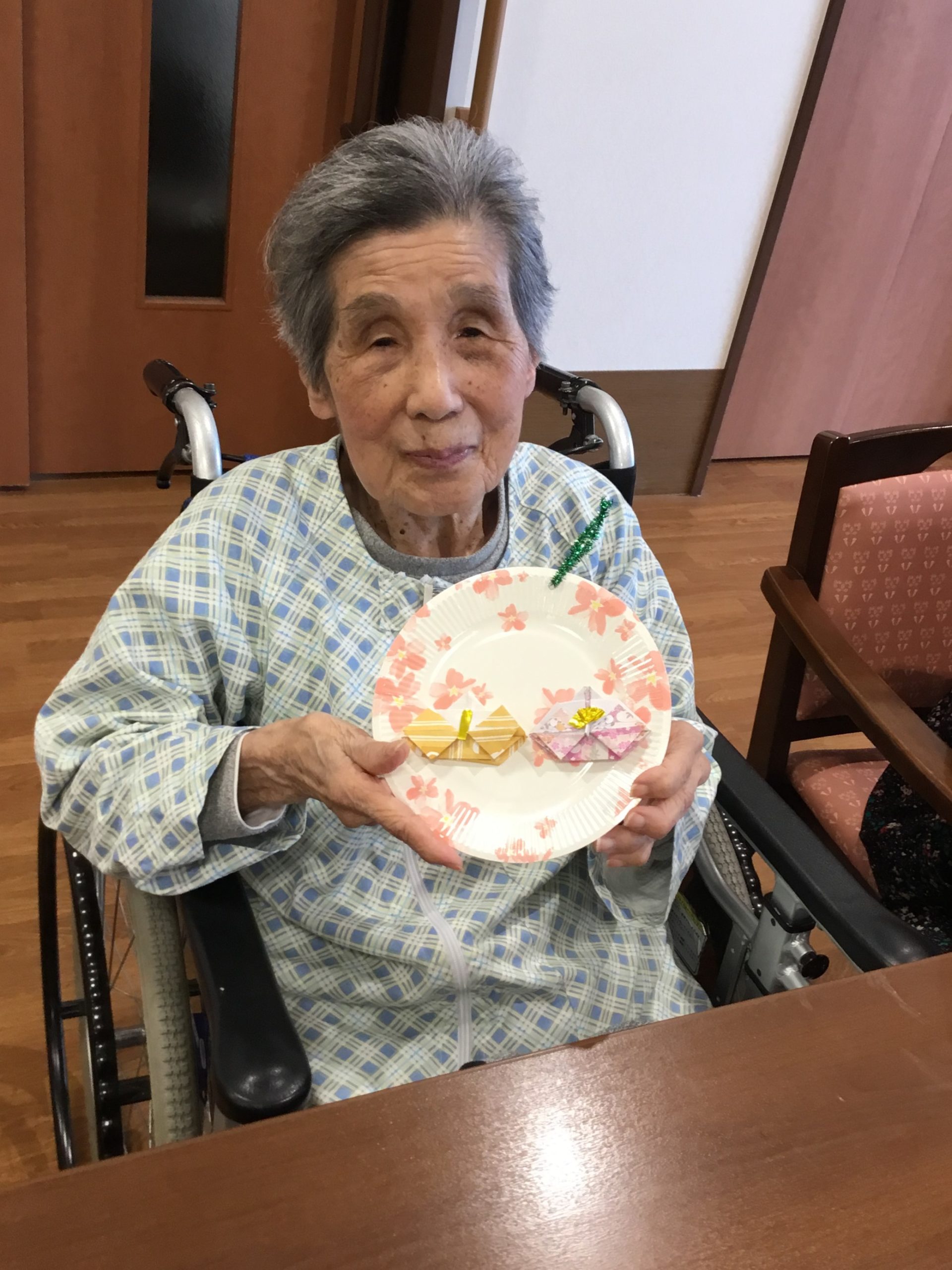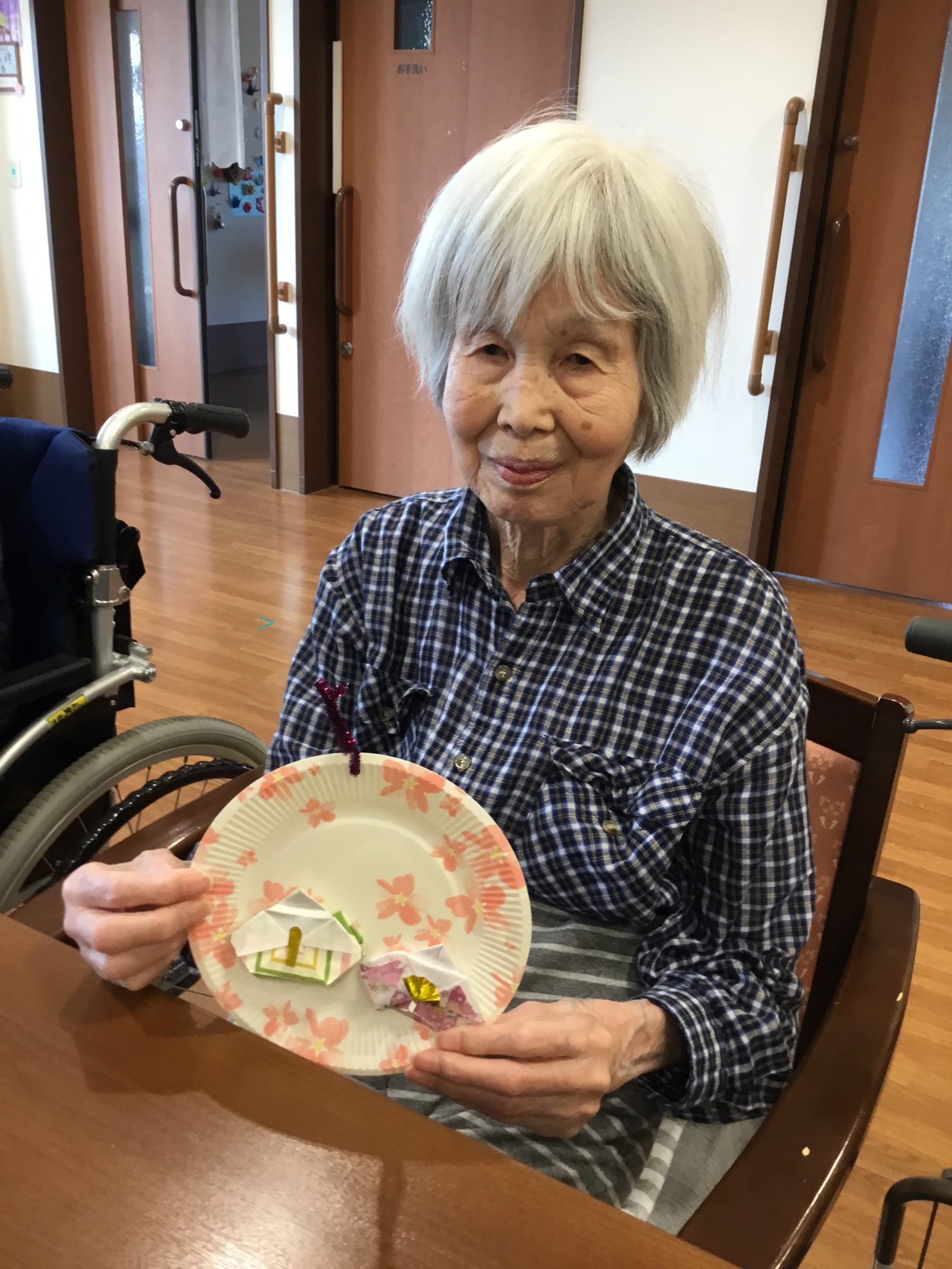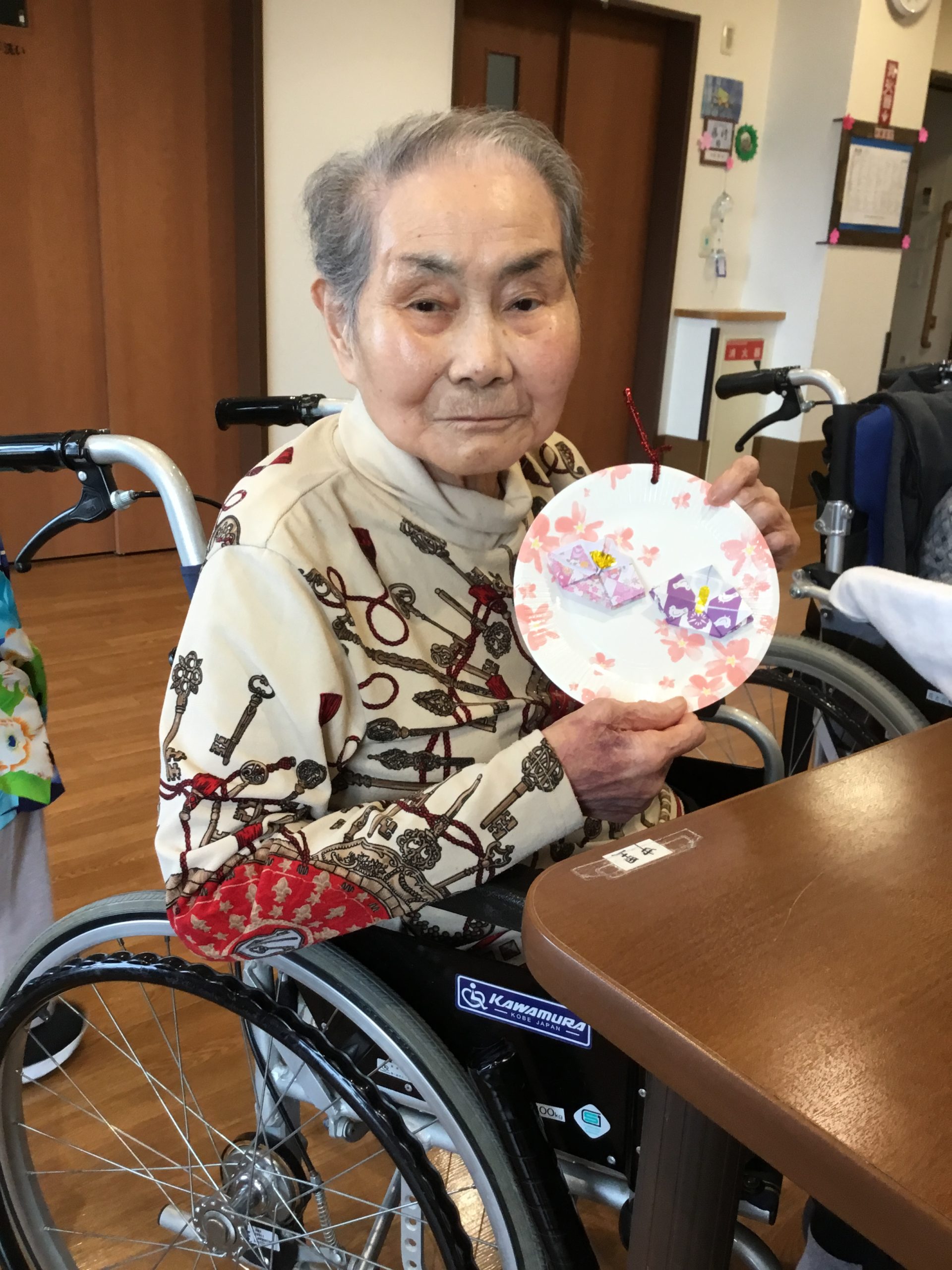 みどりの風鶴ヶ島、十二周年の開設記念レクリエーション!続いては、本館3階 藤袴・早蕨ユニット。おひな様の壁掛け飾りと、ケーキ作りを楽しみました!