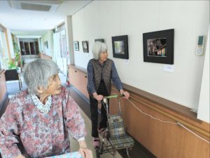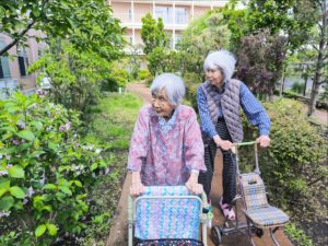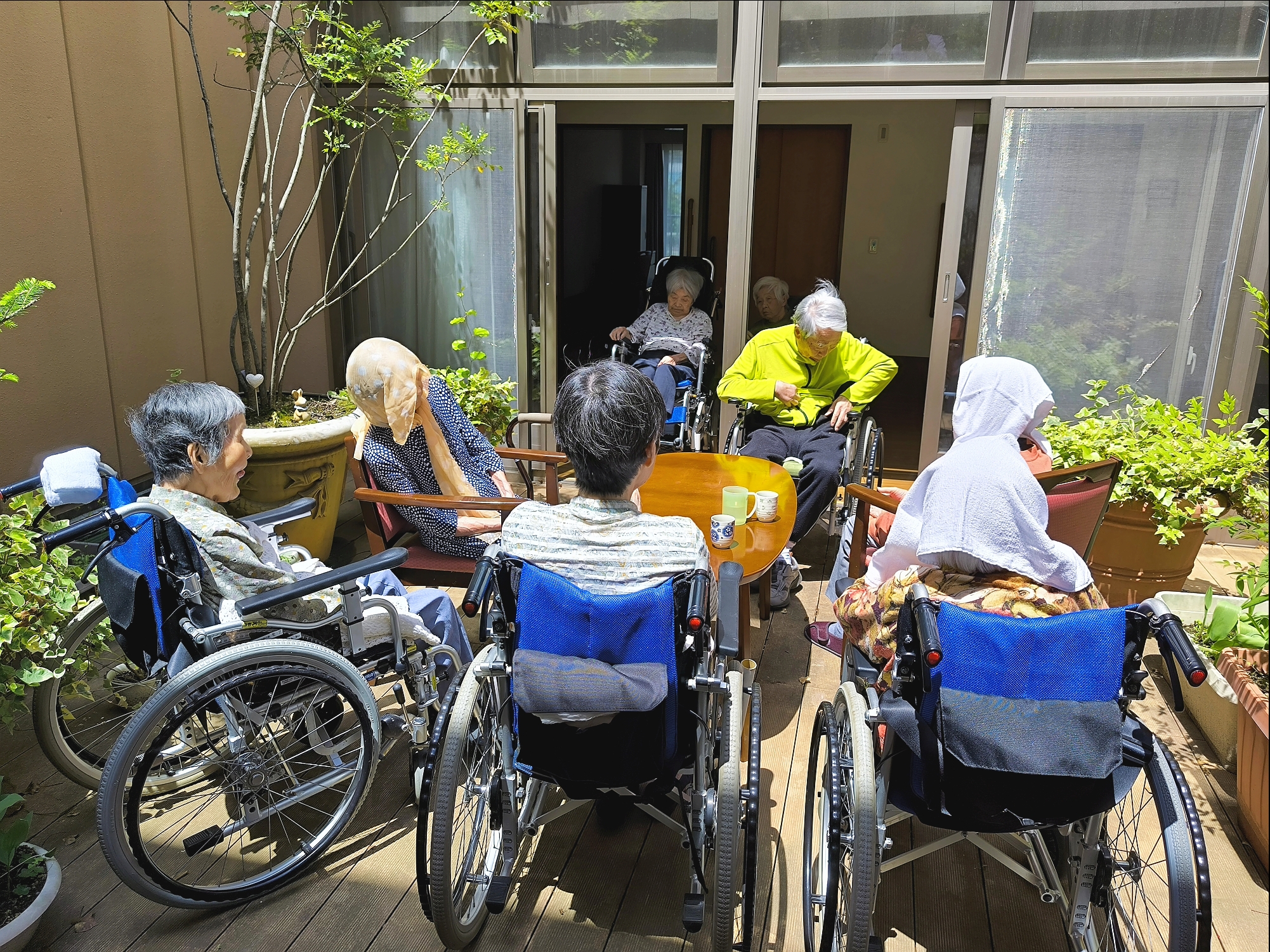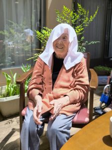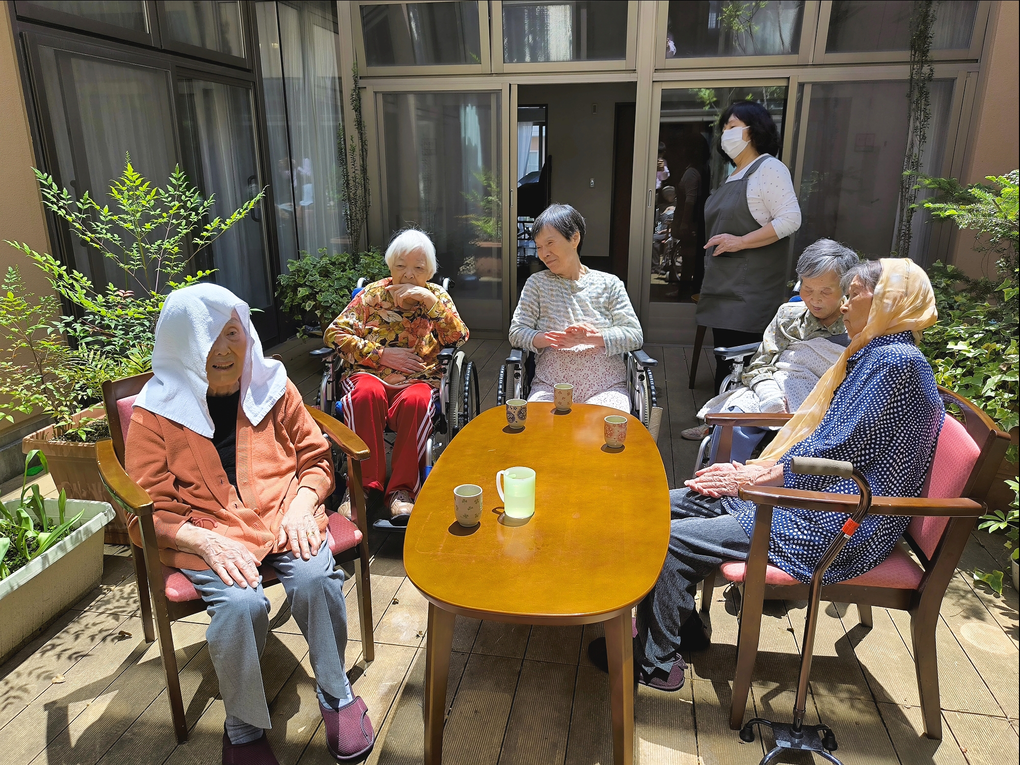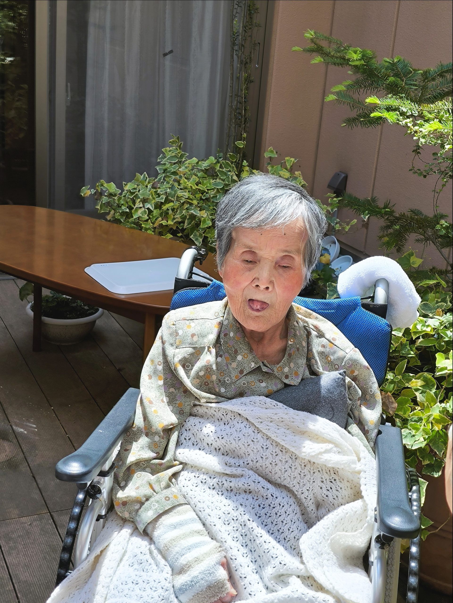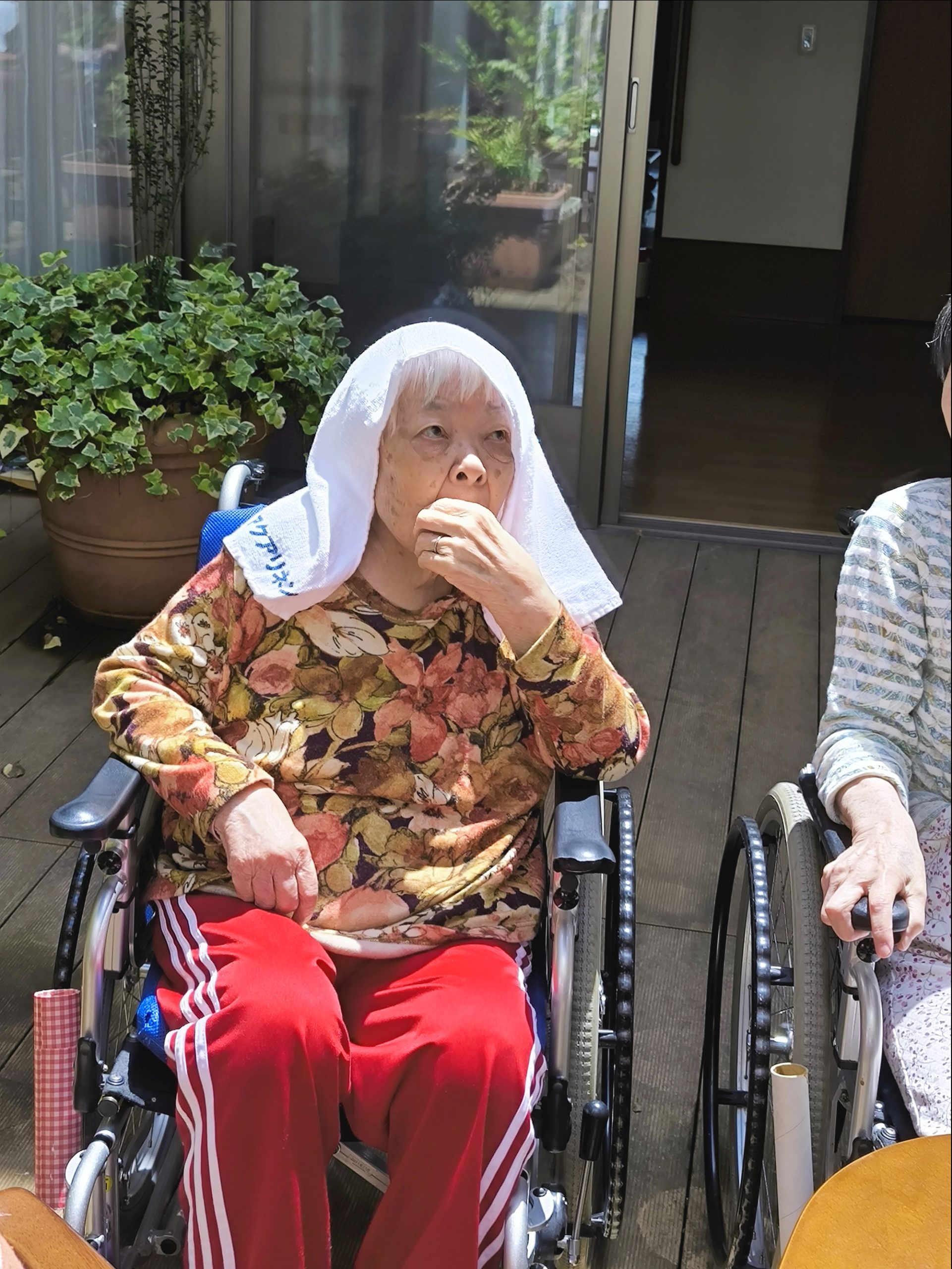 ユニットに隣接した中庭で、日向ぼっこしながら、歌を歌いました!