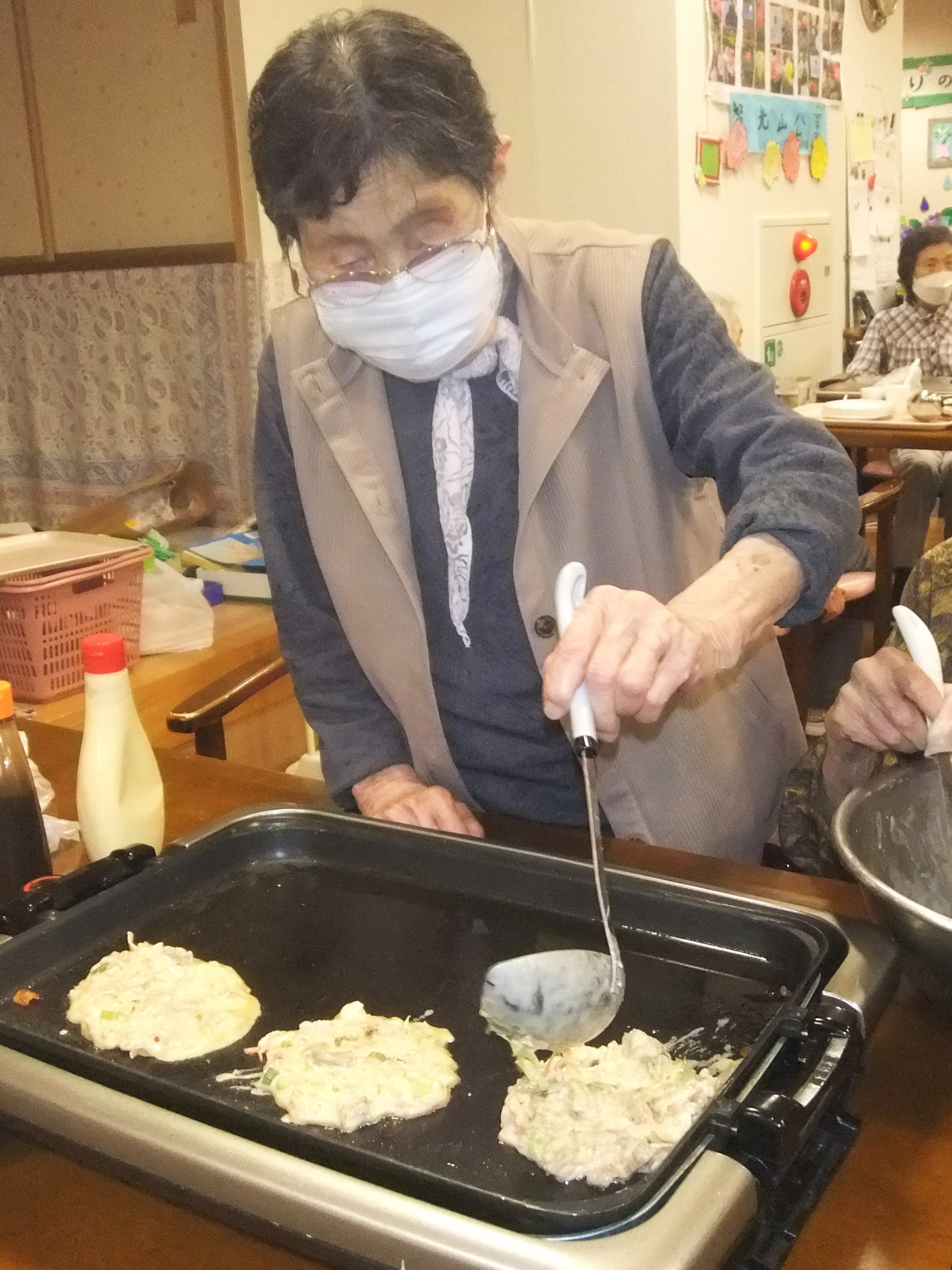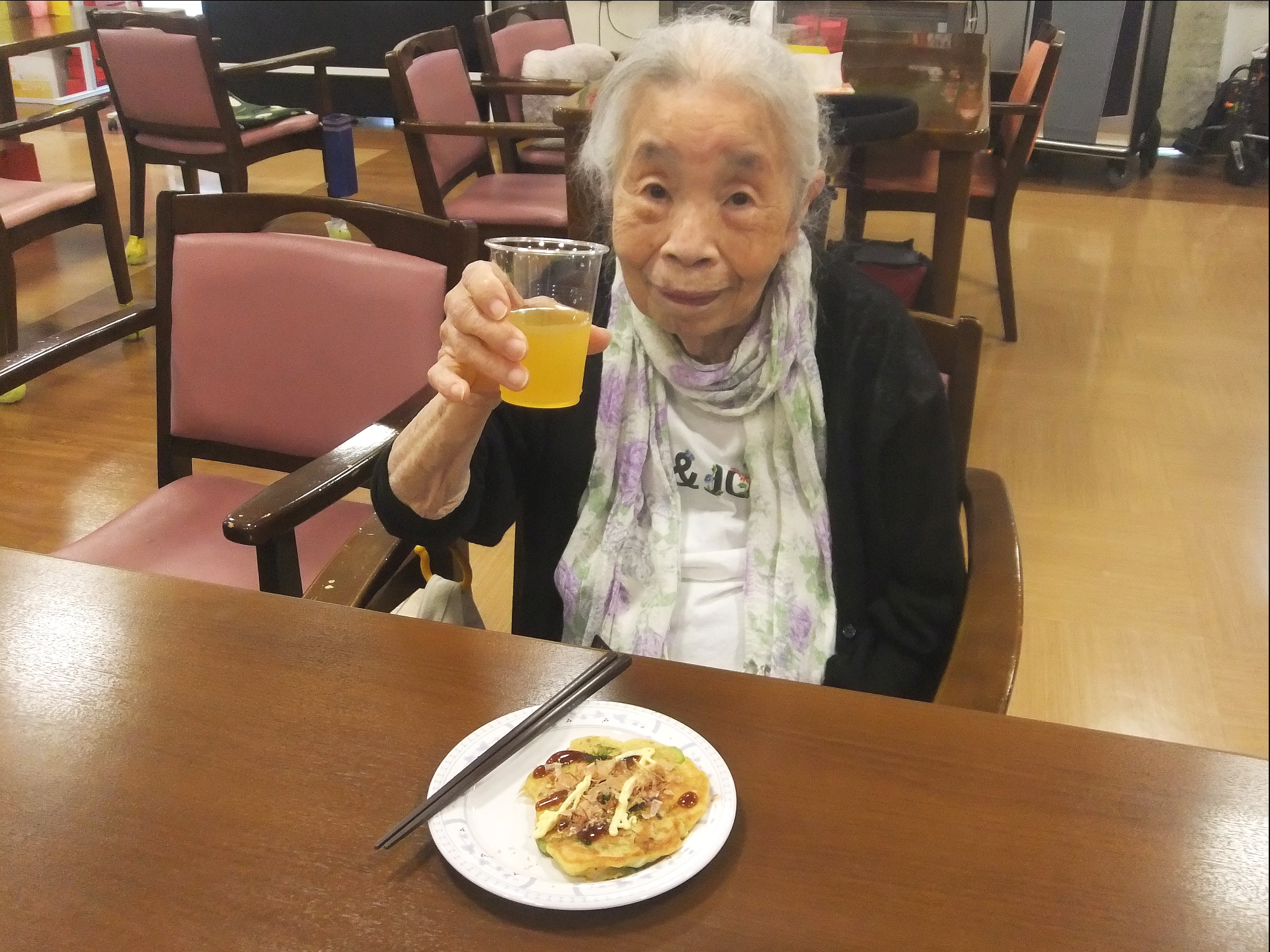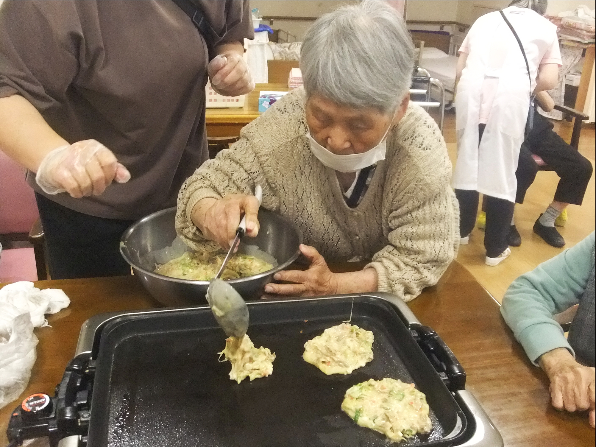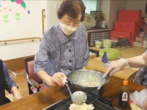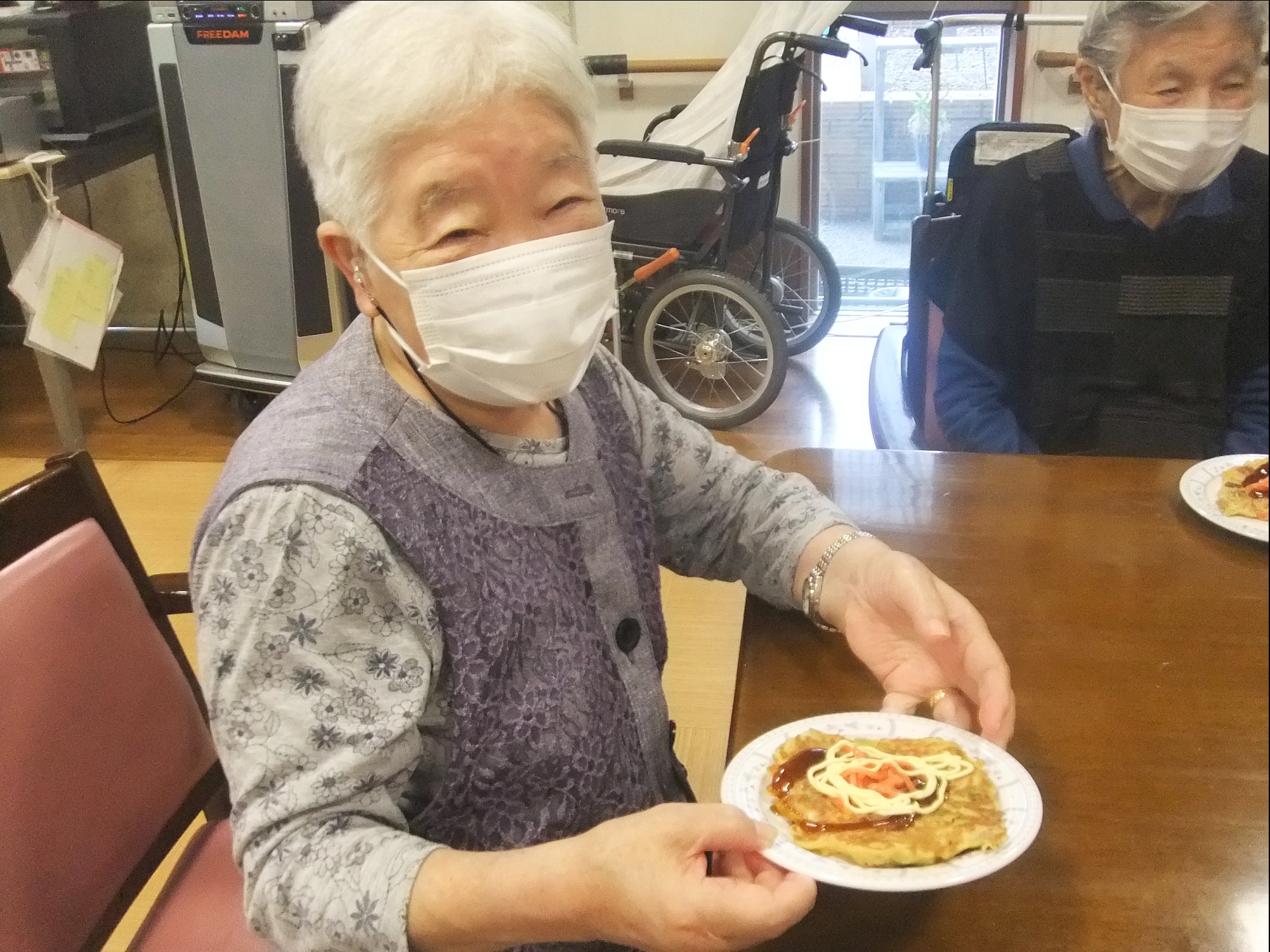 本館1階、デイサービスセンター「花の宴」で毎月開催される、レクリエーション!今回は、お好み焼きを焼いて、食べました!
