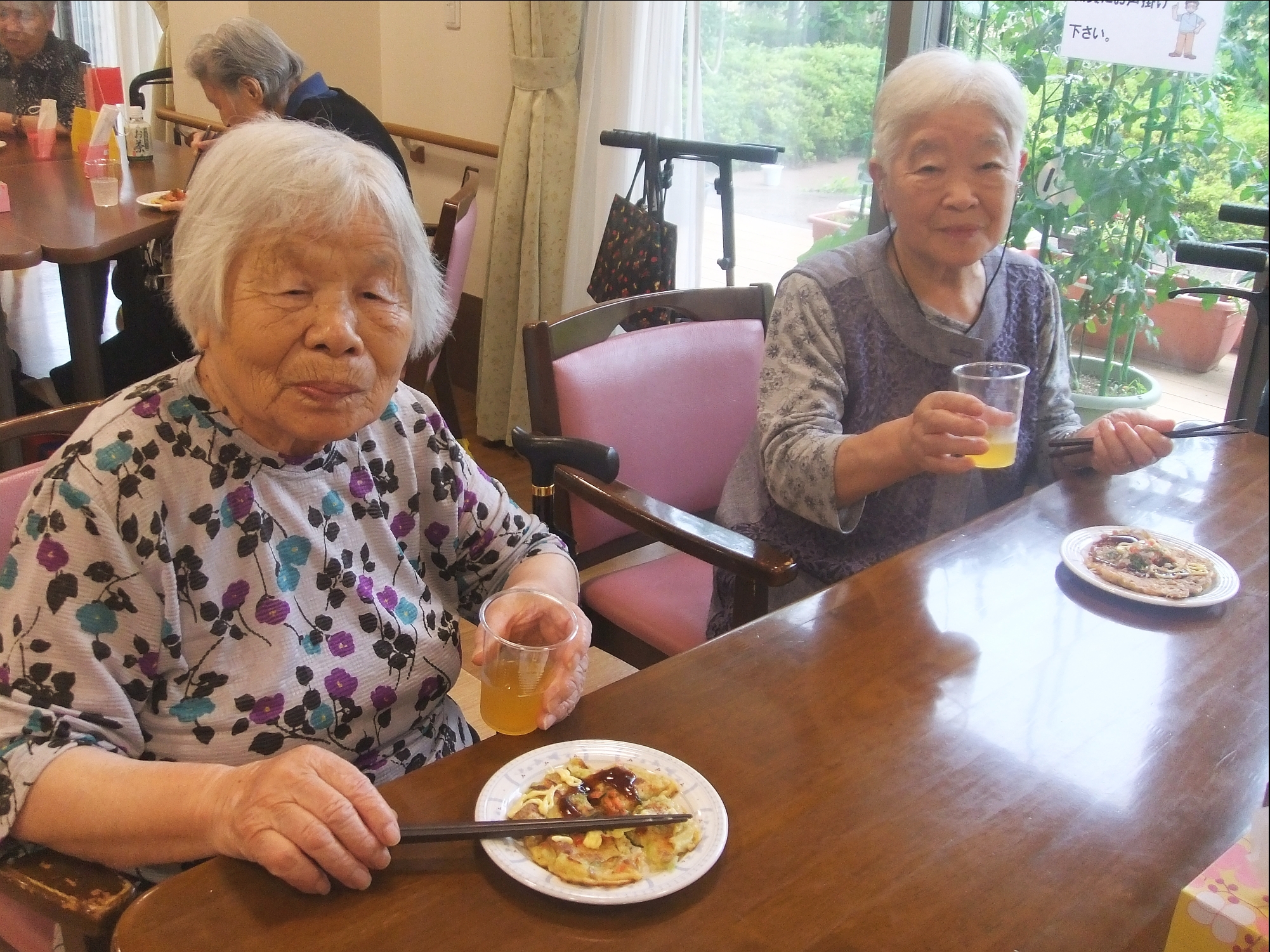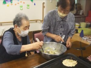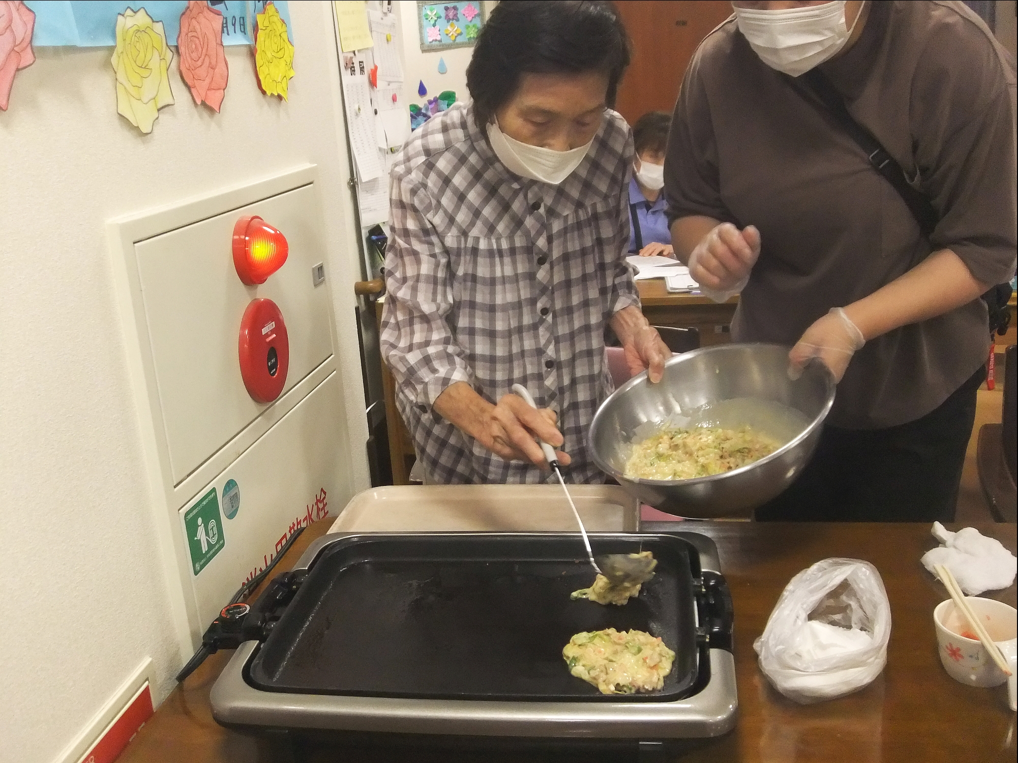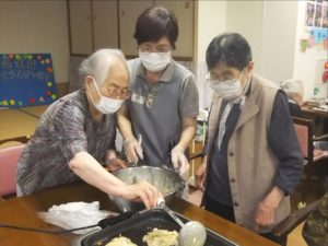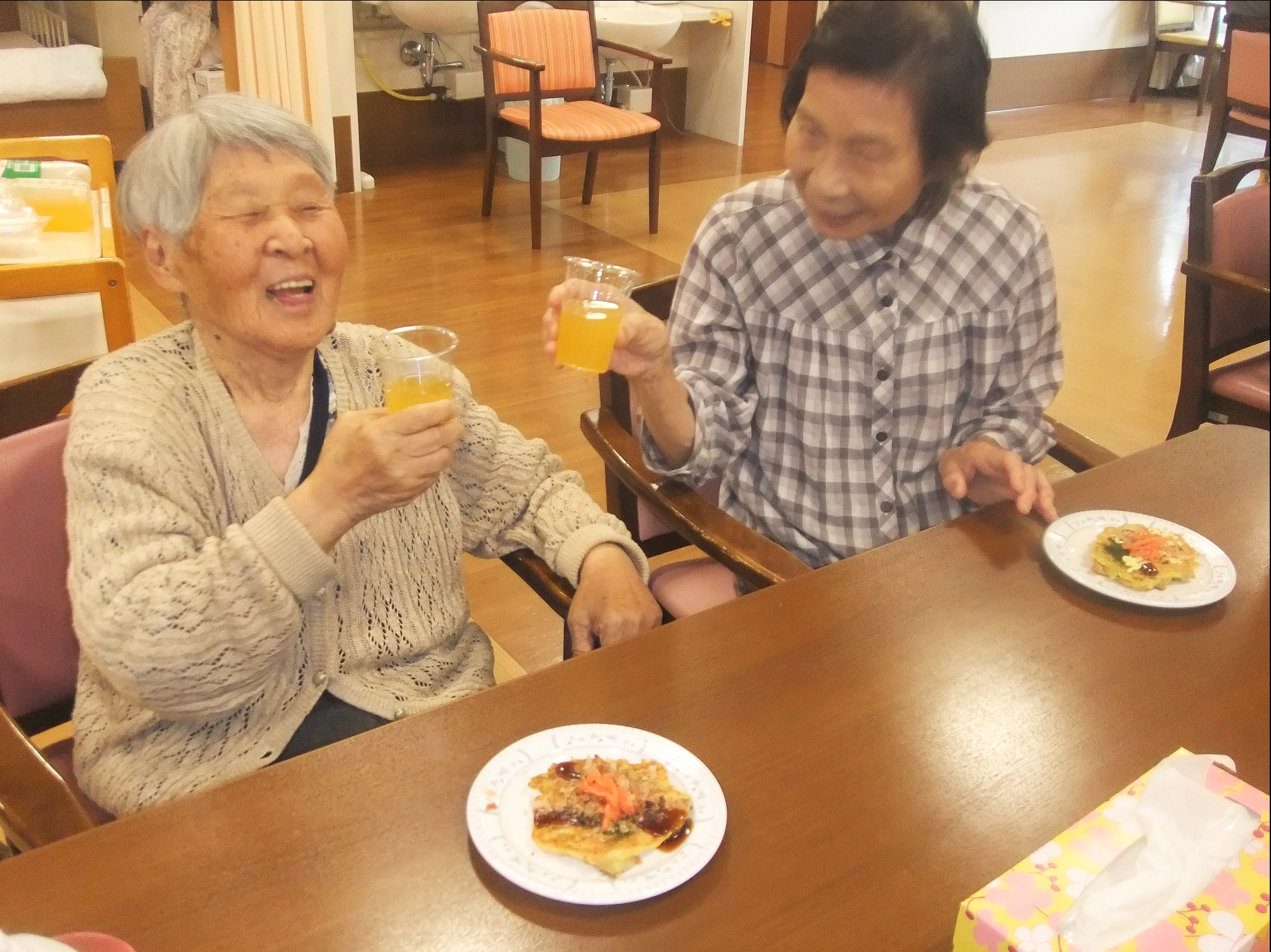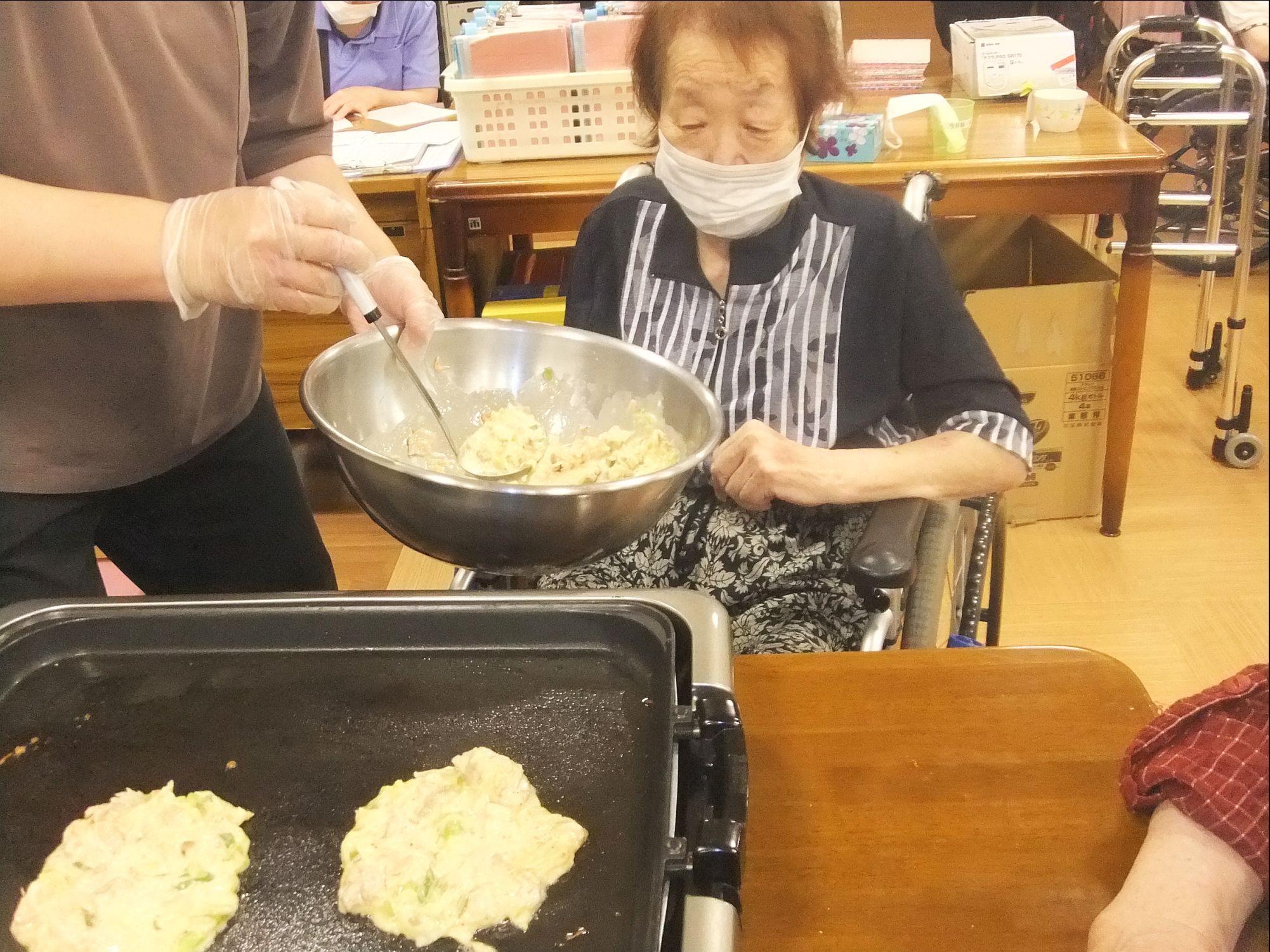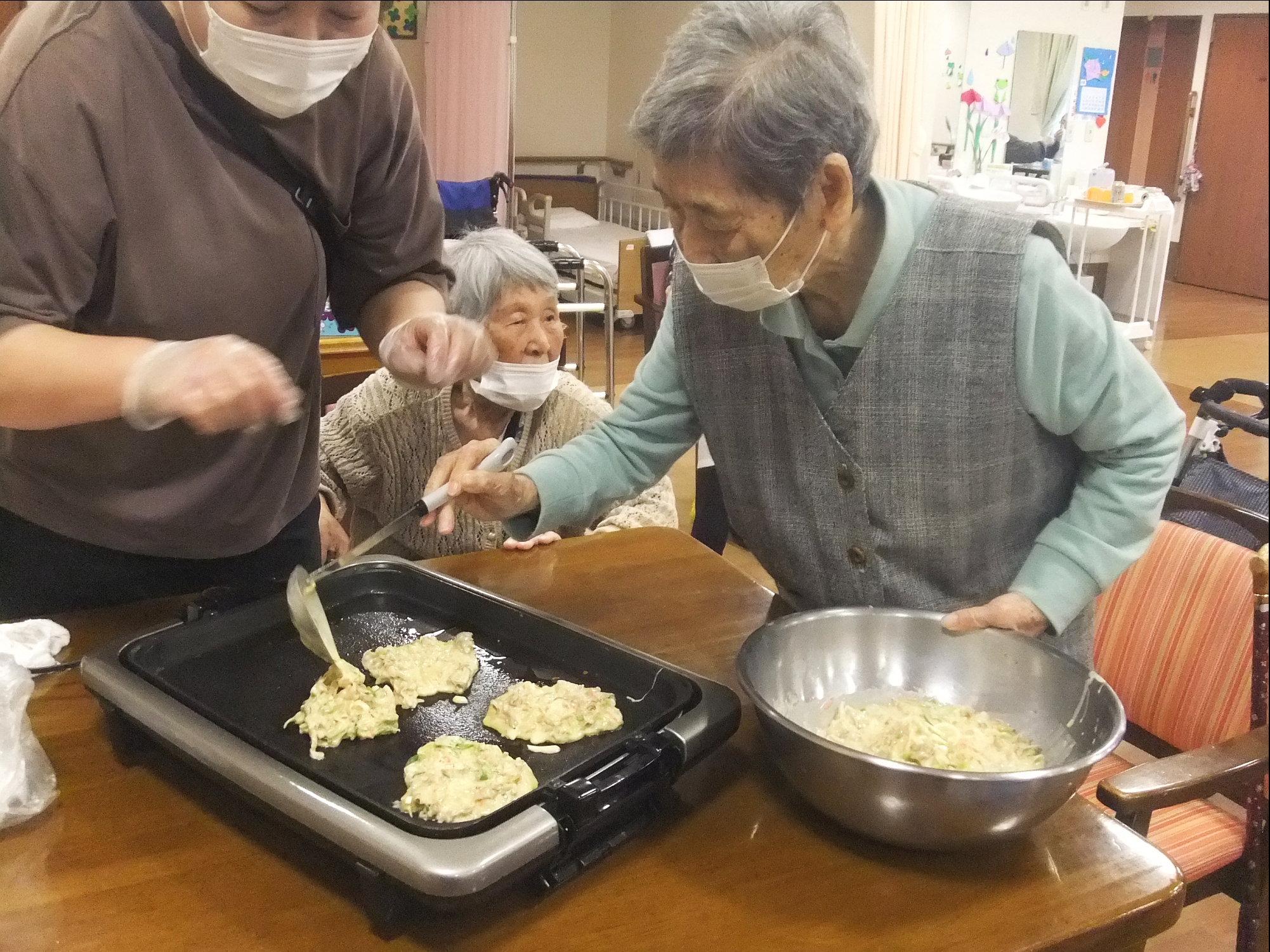 本館1階、デイサービスセンター「花の宴」で毎月開催される、レクリエーション!今回は、お好み焼きを焼いて、食べました!