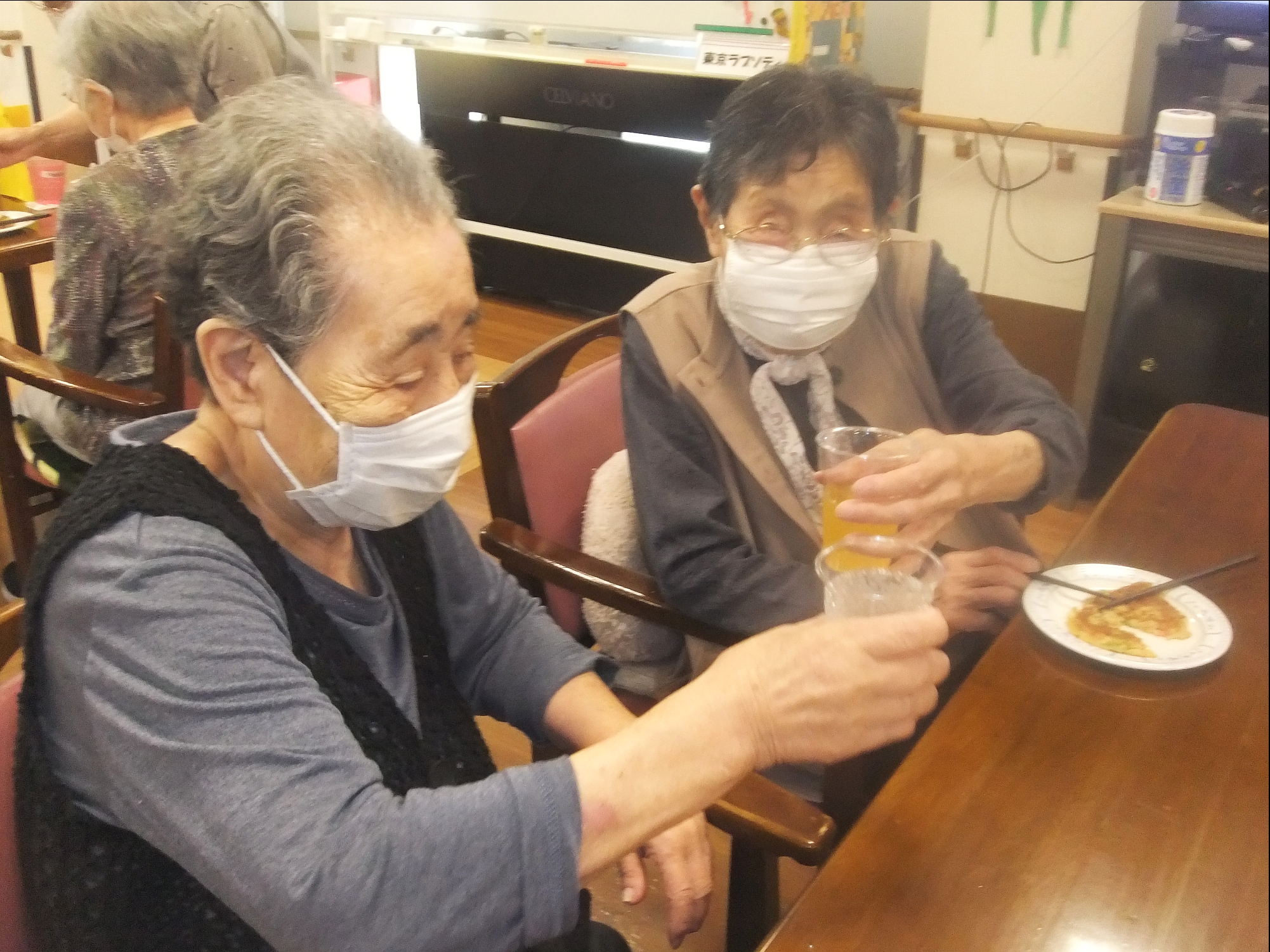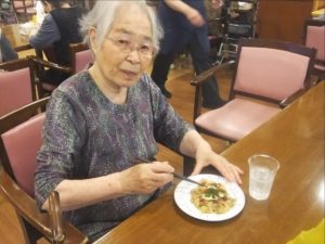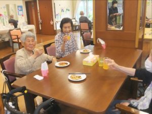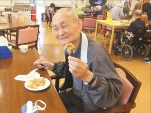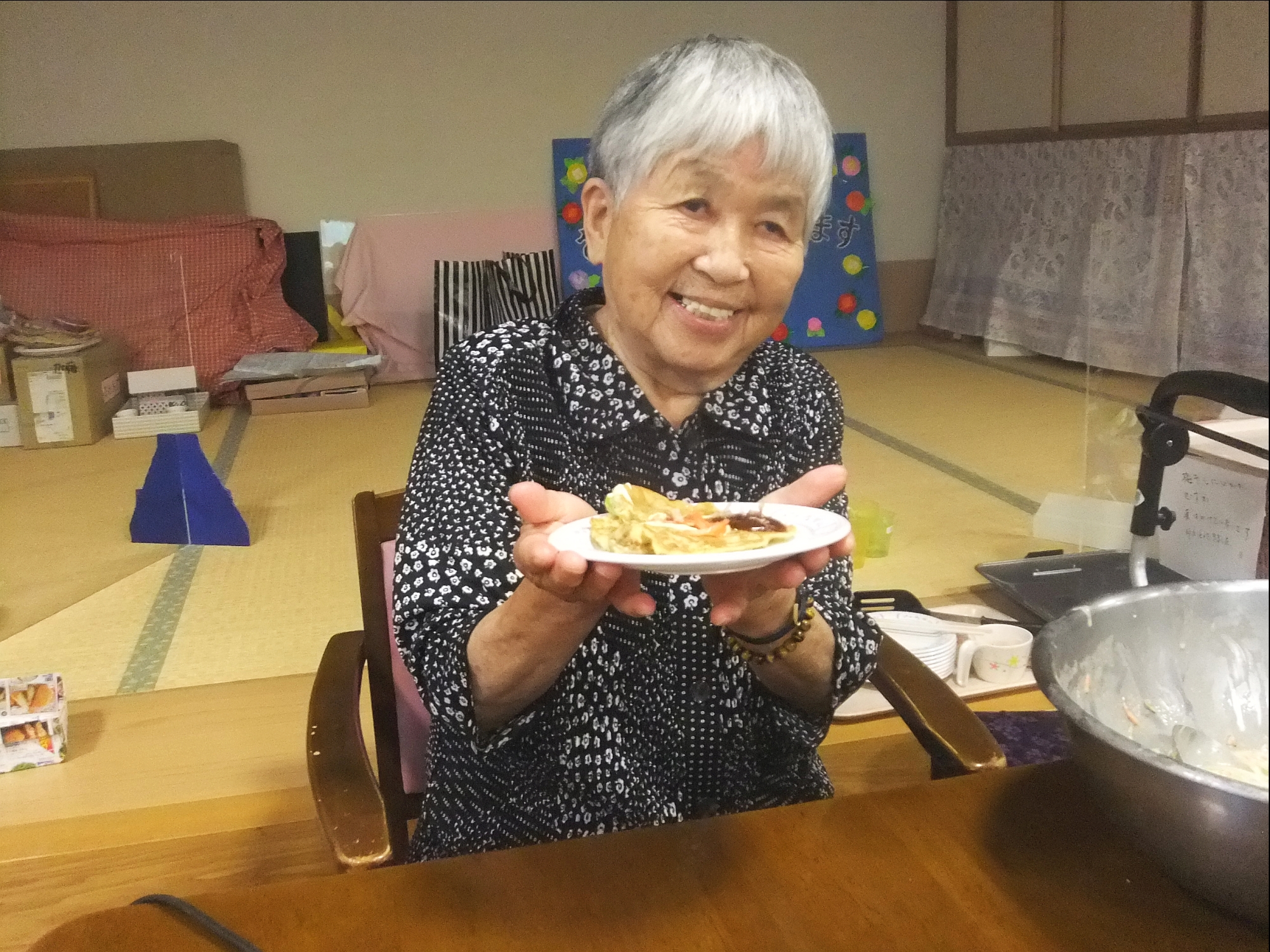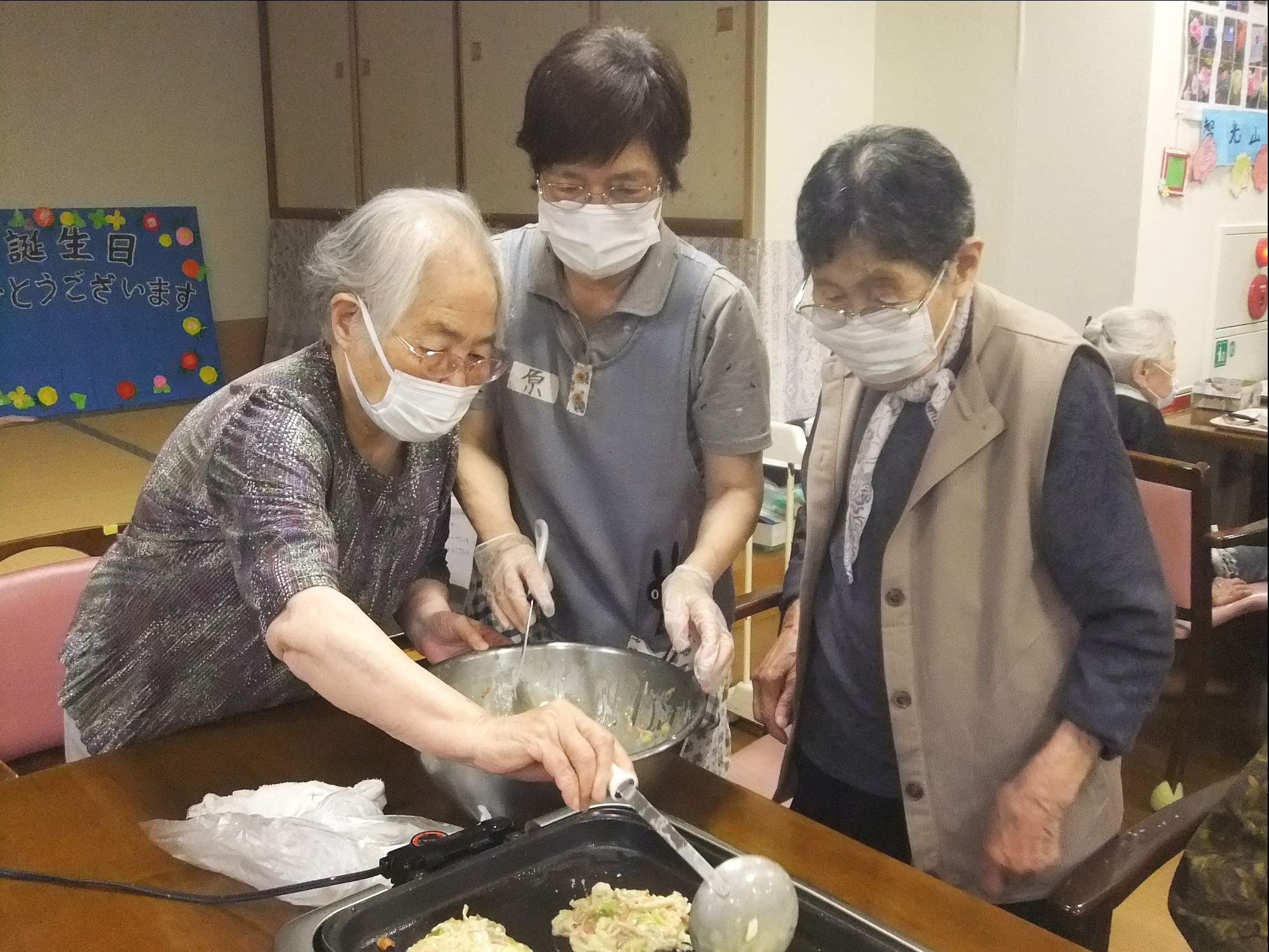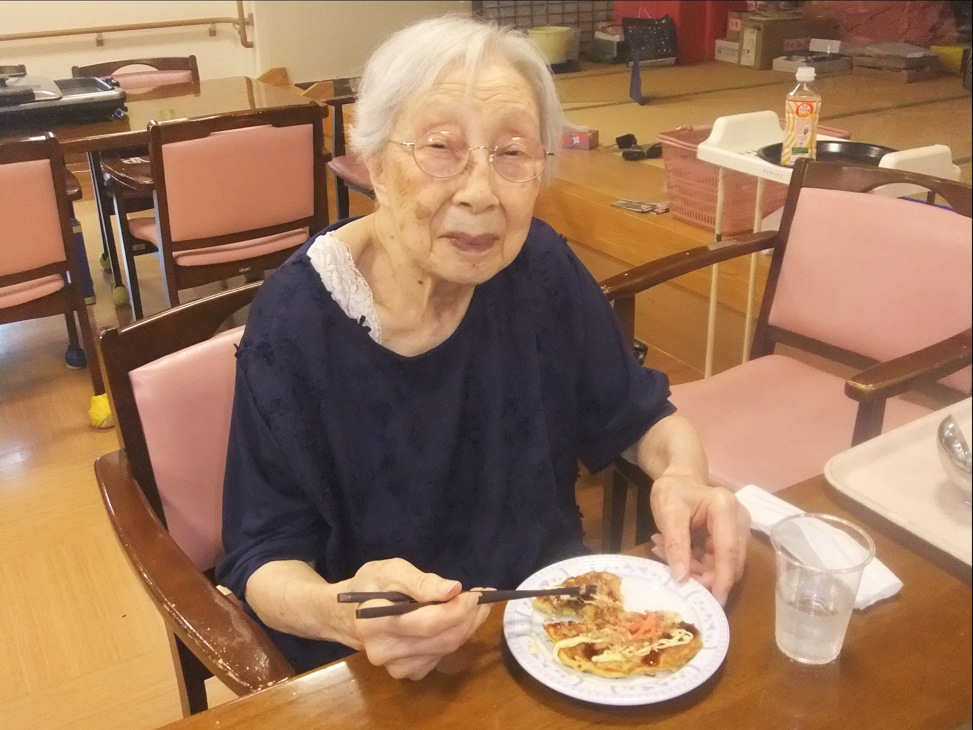 本館1階、デイサービスセンター「花の宴」で毎月開催される、レクリエーション!今回は、お好み焼きを焼いて、食べました!