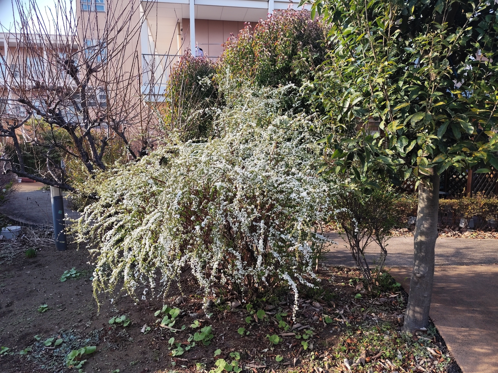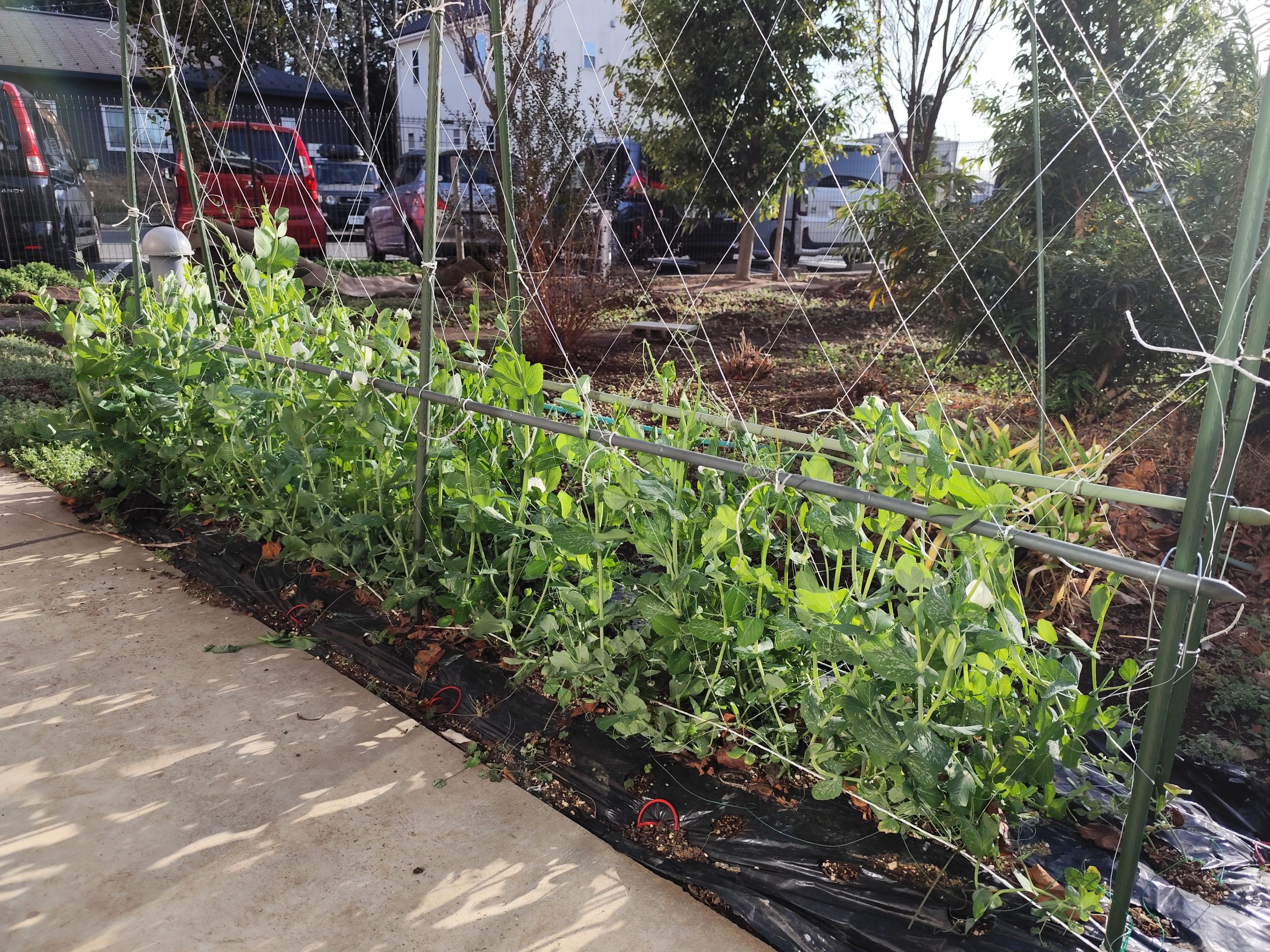 みどりの風鶴ヶ島の中庭では、ユキヤナギが咲いています!エンドウ豆の収穫も、楽しみですね!