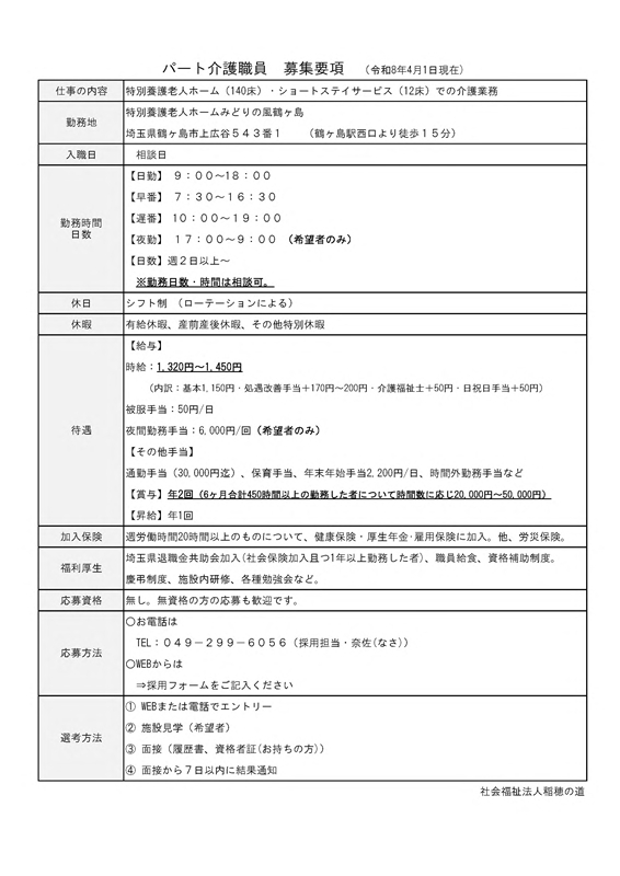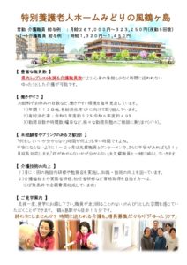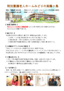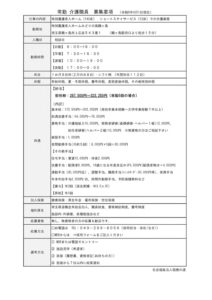 特別養護老人ホーム・ショートステイサービスで勤務いただける常勤介護職員2名を募集いたします。ご見学も随時受け付けておりますので、ぜひ一度足をお運びください。県内でもトップクラスの介護職員数を有し、ゆったりとした介護を実現している職場環境を直接ご覧いただけます。